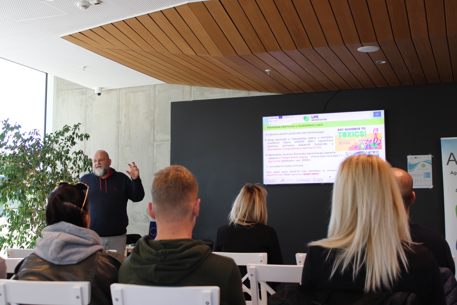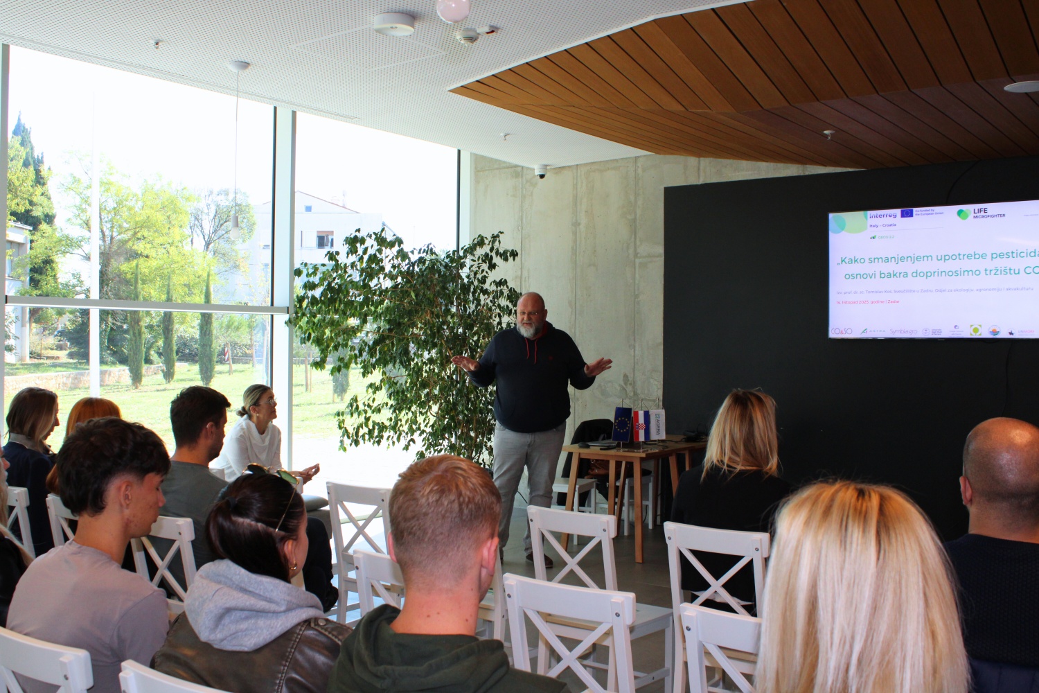 Tomislav Kos, izv. prof. dr. sc. s Sveučilišta u Zadru bio je gost predavač te je govorio o smanjenju upotrebe pesticida na bazi bakra i njegovom utjecaju na tržište CO₂ i klimatsku politiku. Istaknuo je važnost očuvanja biološke aktivnosti tla i povećanja kapaciteta tla za vezivanje ugljika, što je ključno za ostvarenje europskih klimatskih ciljeva. Prikazane su i procjene ušteda CO₂ te ekonomske i ekološke koristi koje donosi primjena održivih praksi.